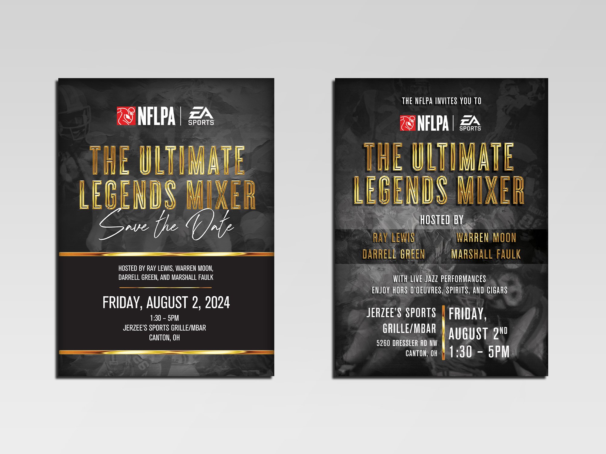 The Ultimate Legends Mixer celebrated new Pro Football Hall of Fame inductees and other NFL legends. For this event, I designed a classic and timeless visual theme, symbolizing the players’ lasting legacy. I incorporated gold lettering and accents, inspired by the Hall of Fame busts, to reinforce the prestige of the occasion, while the black-and-white background imagery of legendary players added a sense of history and reverence. A old yearbook came to mind while I was designing.