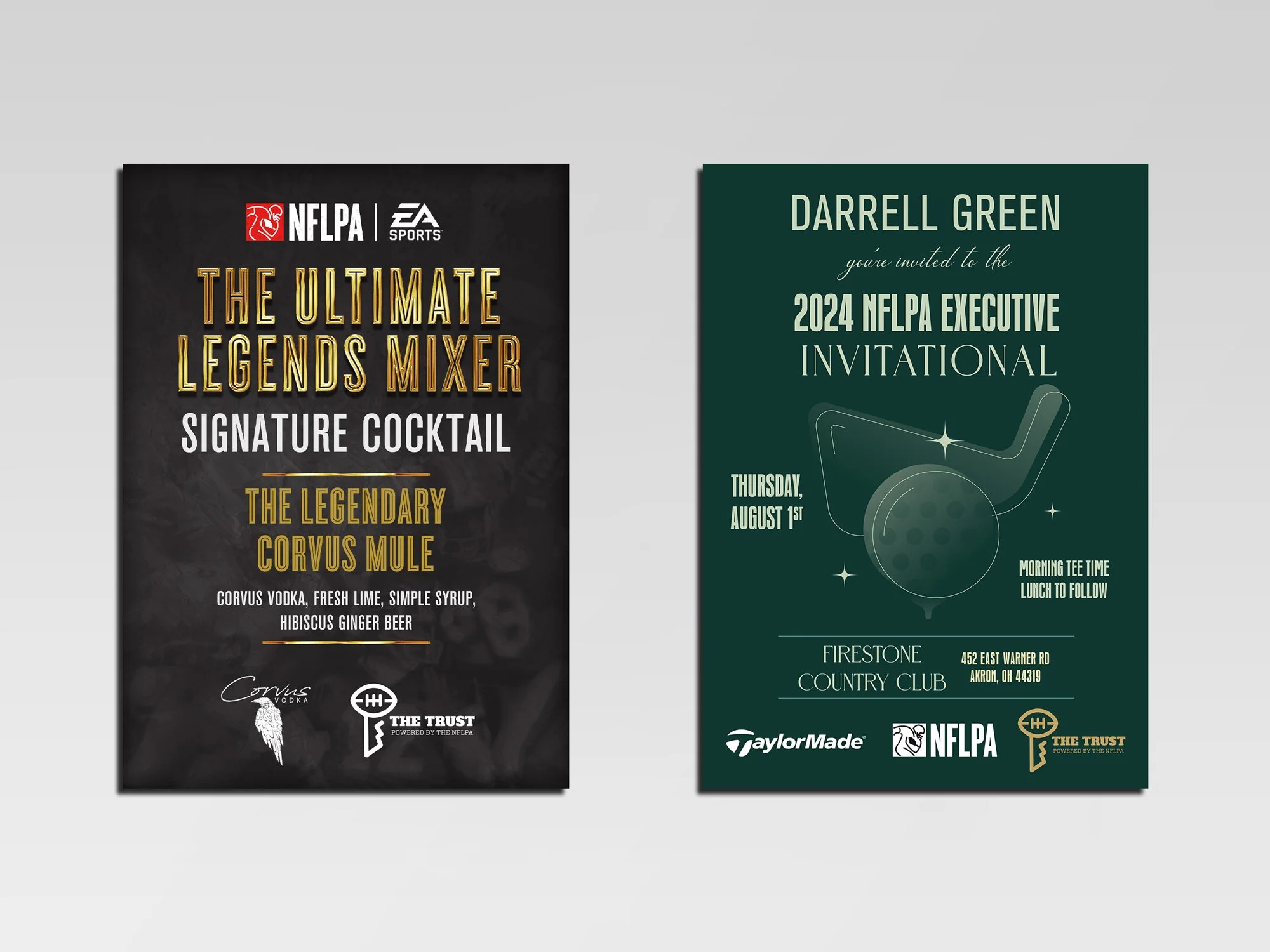 As part of the festivities, the NFLPA hosted an exclusive golf tournament for select inductees, the 2024 NFLPA Executive Invitational. I designed the event flyer to reflect the elegance and exclusivity of the occasion, using a deep green color palette reminiscent of classic golf course aesthetics. The typography balances bold, metallic gold lettering with clean, modern sans-serif fonts. I developed a few materials for the event, ensuring a cohesive visual identity.